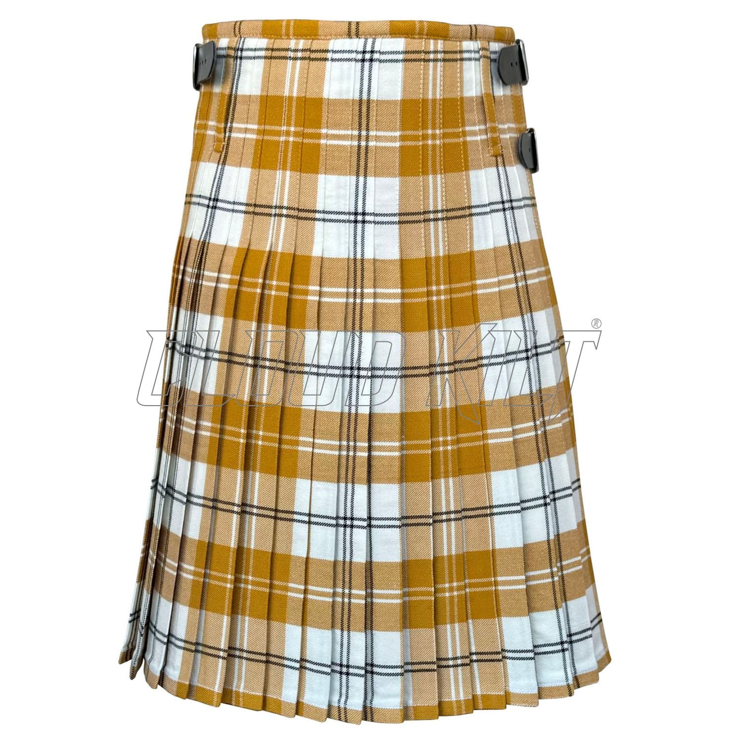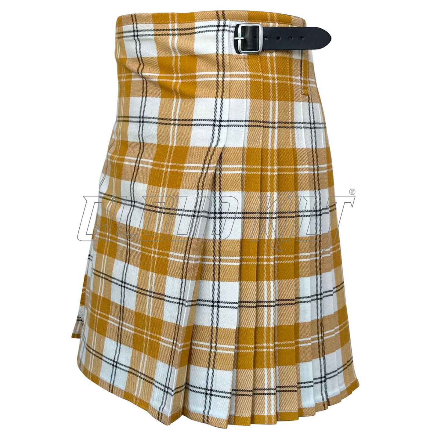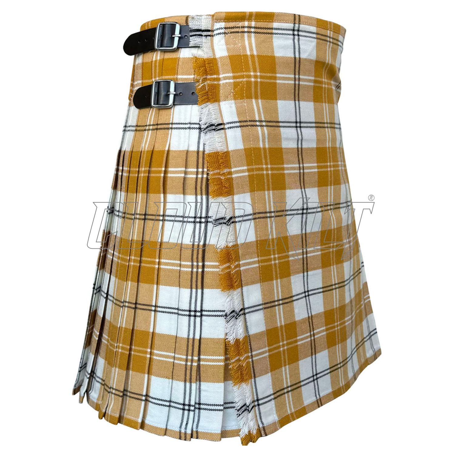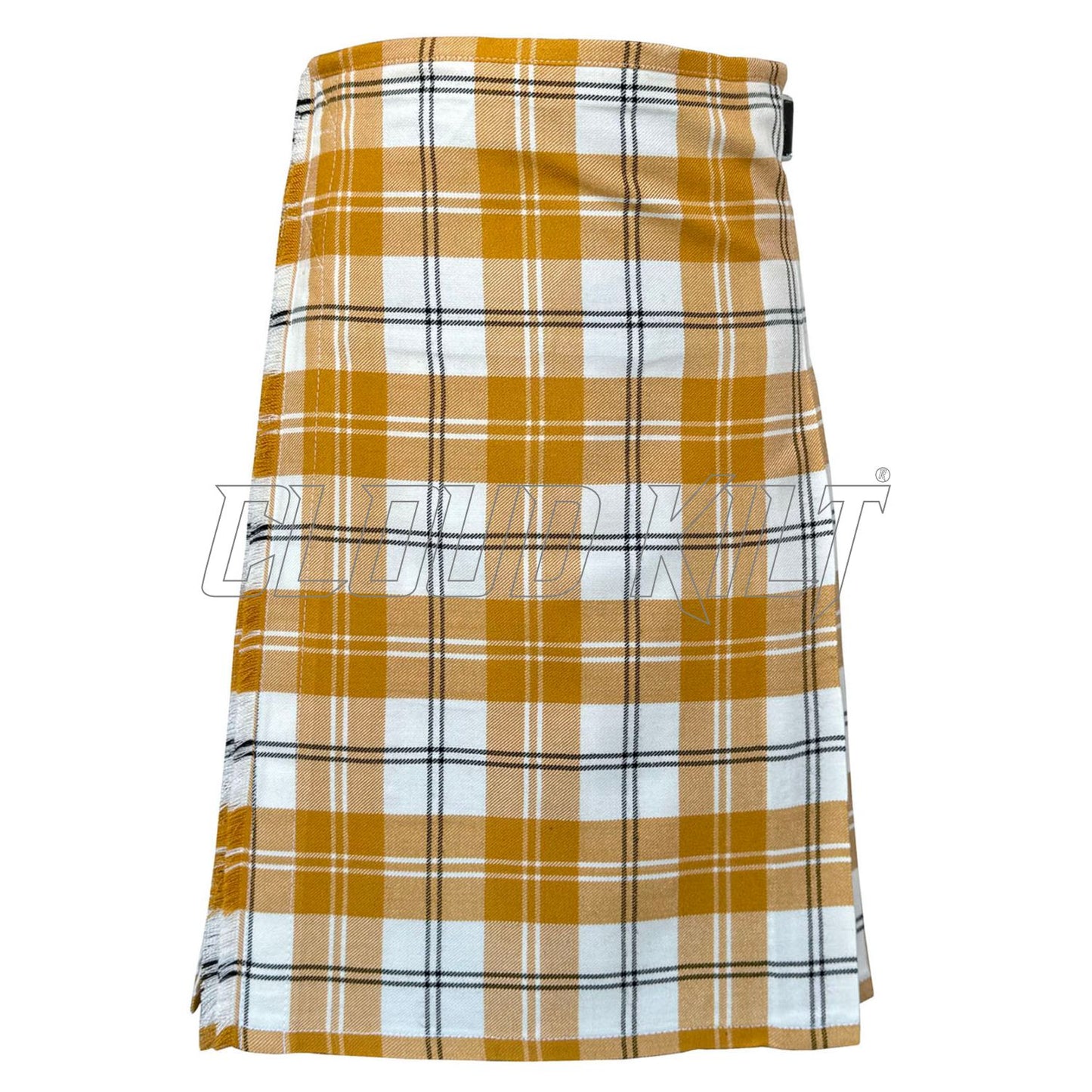 Crafted from premium 16oz fabric, our Ailsa Gold Tartan Kilt is a distinctive Scottish pattern characterized by its rich, warm color palette. It typically features shades of gold, red, and black, woven together in a classic tartan design. This combination creates a luxurious and eye-catching appearance.