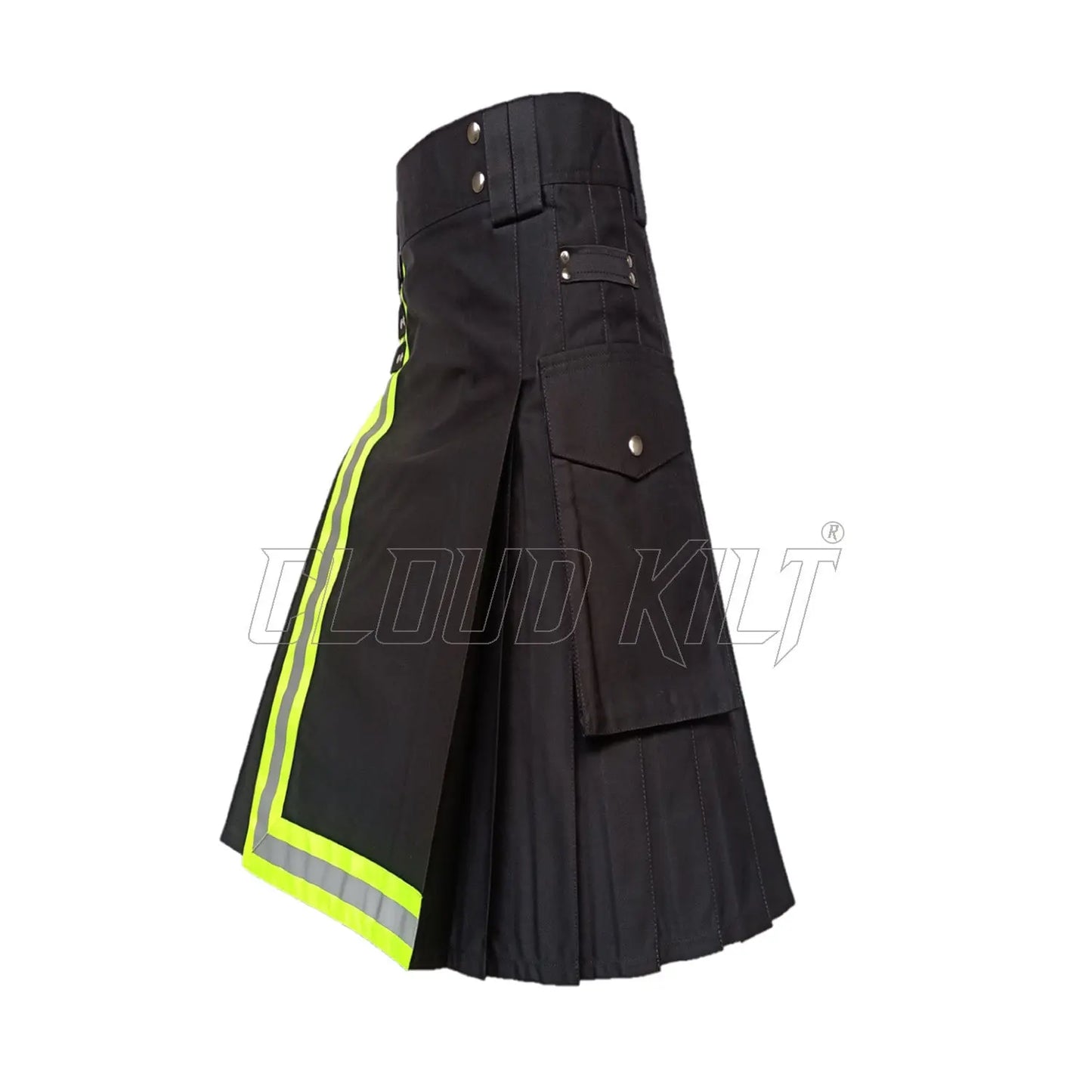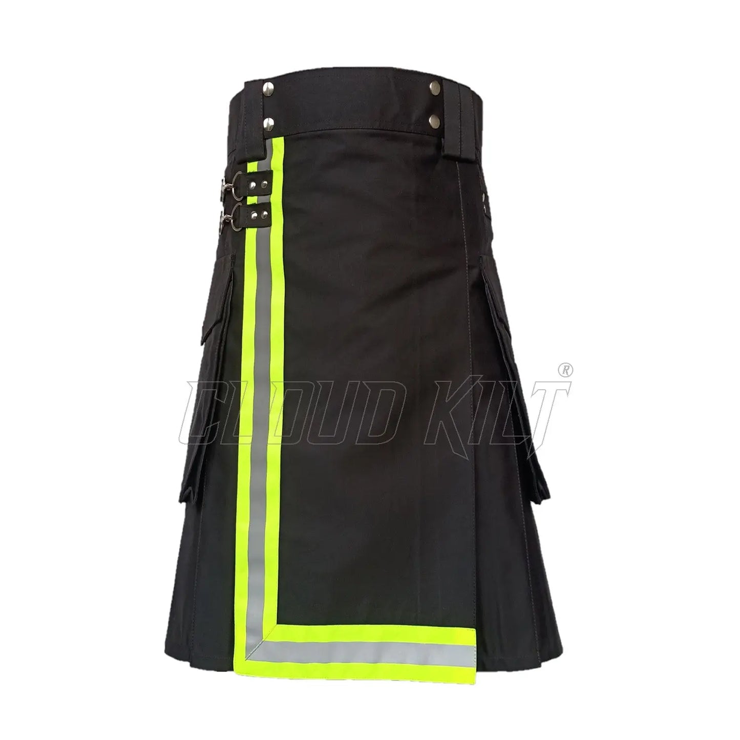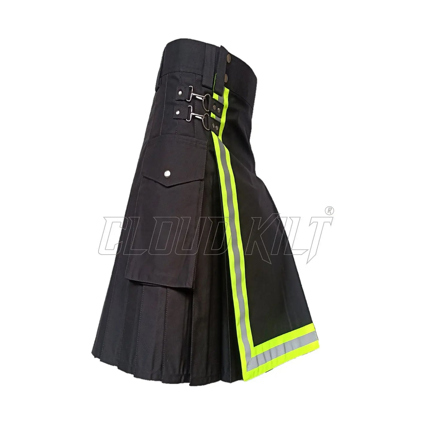 A black high visibility firefighter kilt is a unique blend of traditional Scottish attire and modern firefighting safety gear. It combines the comfort and practicality of a kilt with the essential visibility required for hazardous work environments.