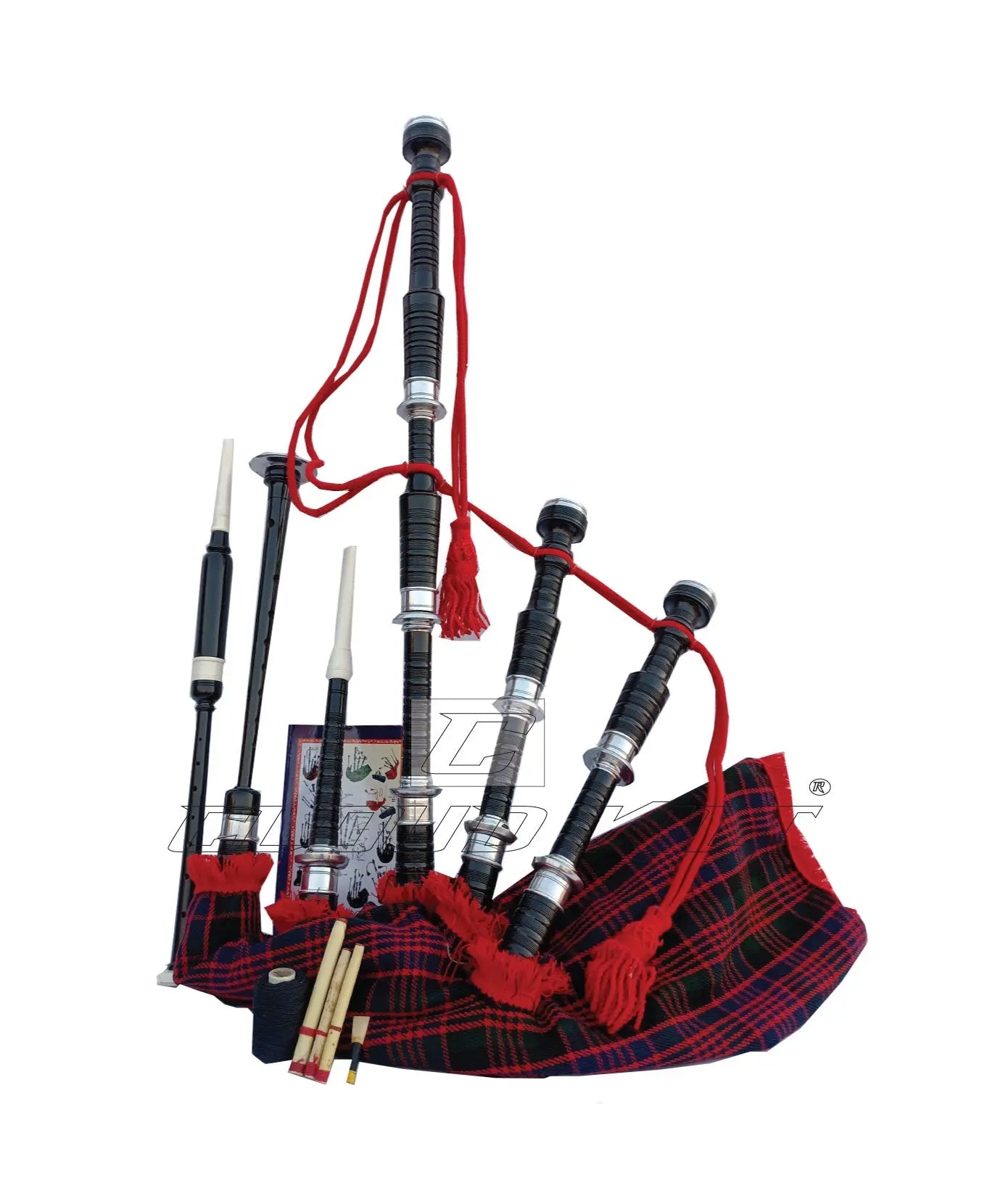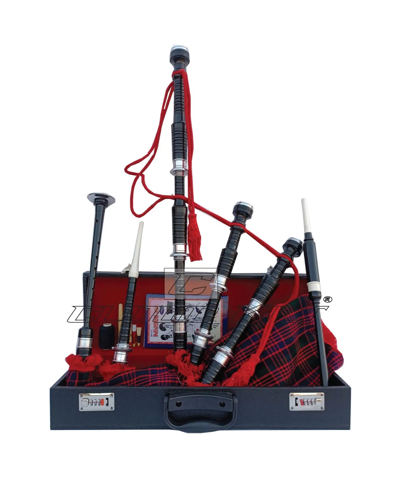 A MacDonald Tartan bagpipe set with a black finish and silver accents is a beautiful and traditional choice. This combination offers a classic look that is both elegant and striking.